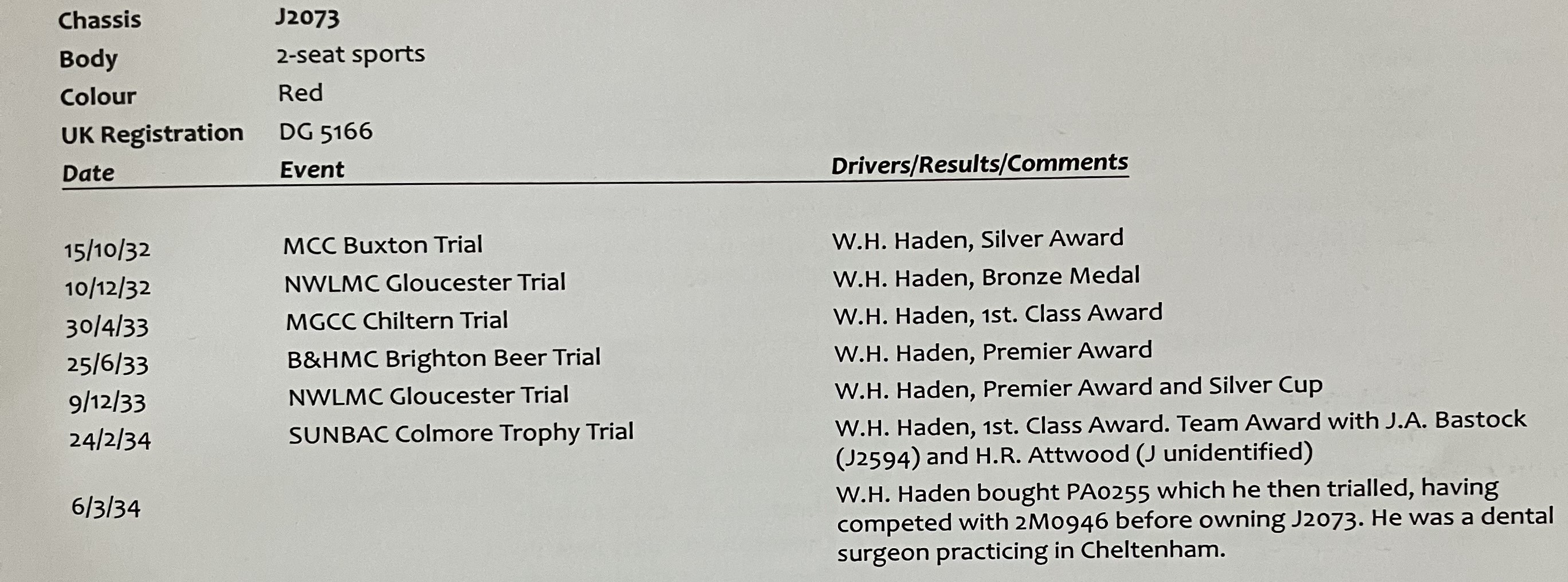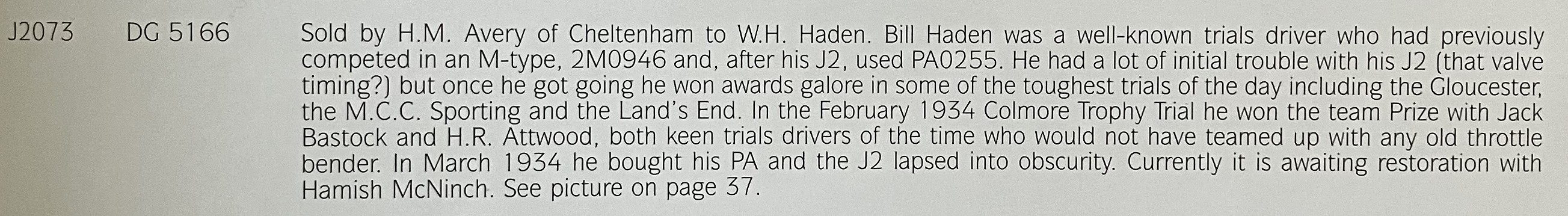 The following exerpt from "How they Ran" by Mike Hawke lists successes Bill Haden had in his J2 (J2073) between 1932 and 1934. It makes reference to the M-type previously used and to PA0255 which followed the J2. Note that not only did he win a First Class award in the 1934 Colmore Trophy trial but he was a member of the winning team with Jack Bastock (J2594) and H.R. Atwood. We also own J2594 whose history is chronicled in a separate section of this web site.